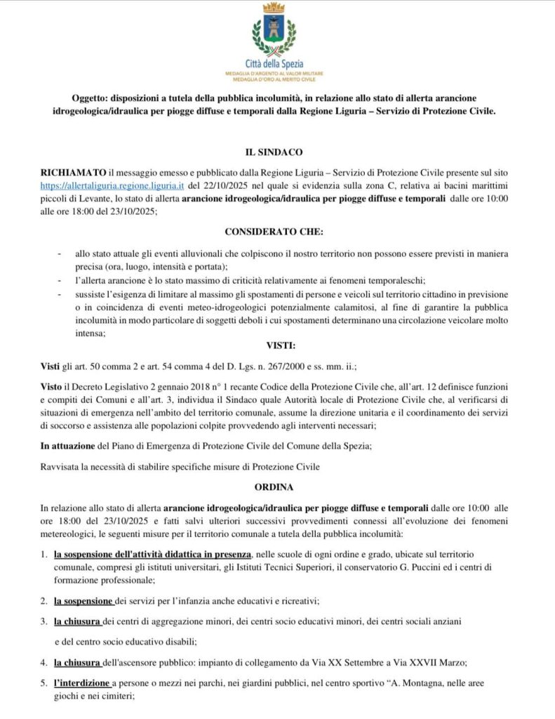 Il giorno 23 Ottobre 2025, sarà sospesa l’attività didattica in presenza a causa delle ordinanze del sindaco Pierluigi Peracchini dovute all’allerta meteo (Arancione).